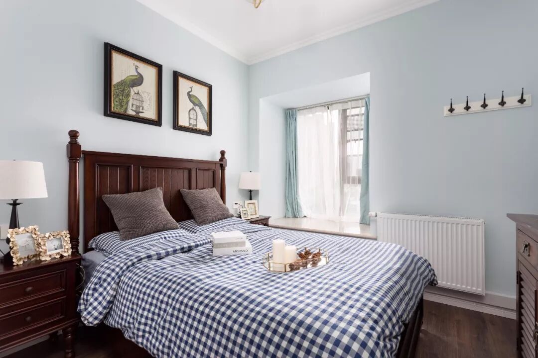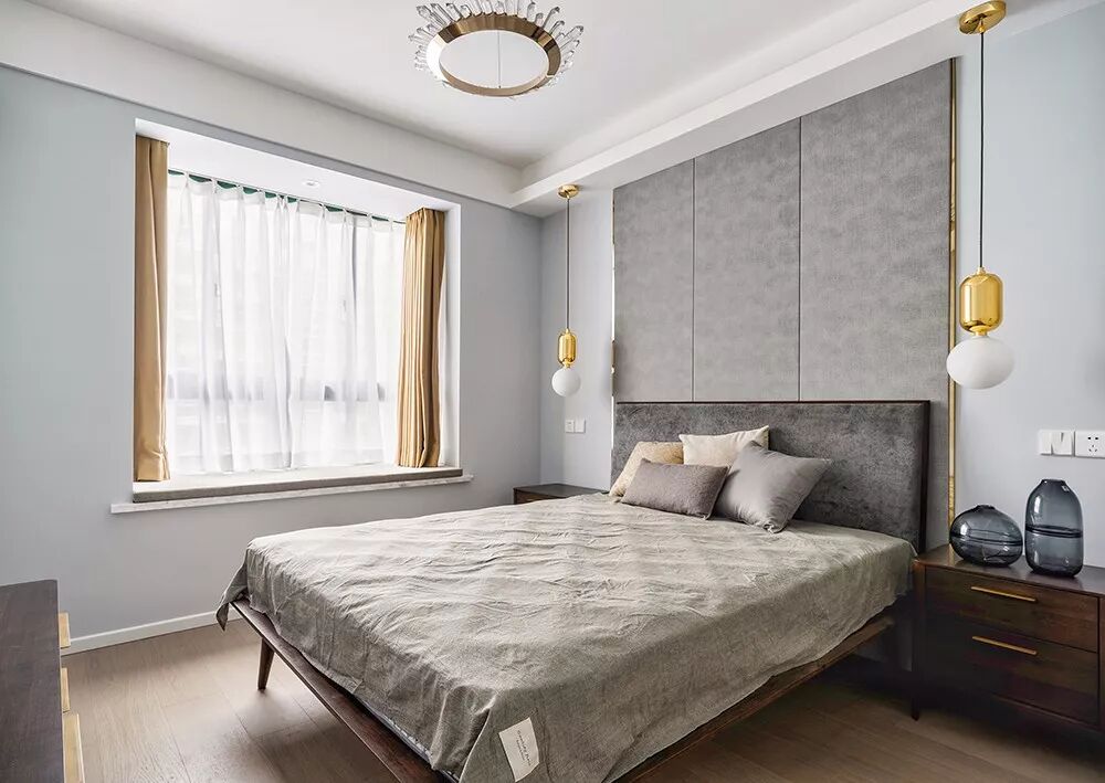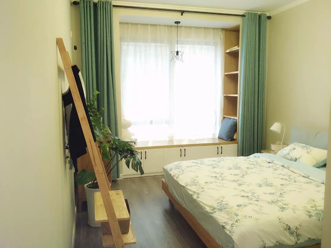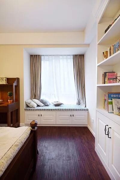 布帘靠墙的话会占用到飘窗窗台以外的空间,如果觉得这样的搭配比较冗余,而且对窗帘侧边漏光不介意,也是可以考虑把窗帘安装在靠窗位置的,这样能保持卧室的简洁感。
